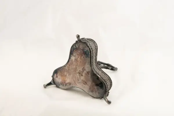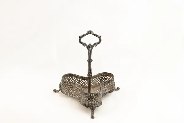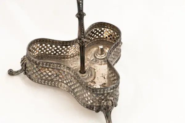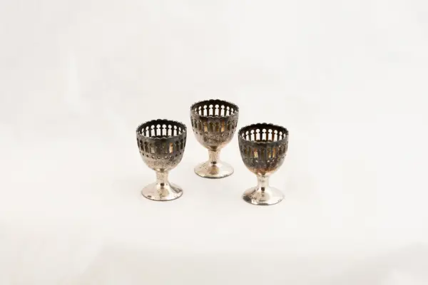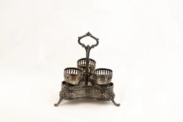 Eggeglassholder med tre eggeglass. Eggeglassholderen er trepassformet og står på tre svungne ben med dekorerte roser på kantene. Den har en midtstang med håndtak, og karmen har gjennombrutt mønster. Oppi eggeglassholderen er tre eggeglass med gjennombrutt mønster av nøkkelhull, og under bunnen er hull som passer i tapp i stative... Eggeglassholder med tre eggeglass. Eggeglassholderen er trepassformet og står på tre svungne ben med dekorerte roser på kantene. Den har en midtstang med håndtak, og karmen har gjennombrutt mønster. Oppi eggeglassholderen er tre eggeglass med gjennombrutt mønster av nøkkelhull, og under bunnen er hull som passer i tapp i stativet. Tinn under bunnen.