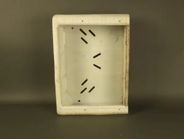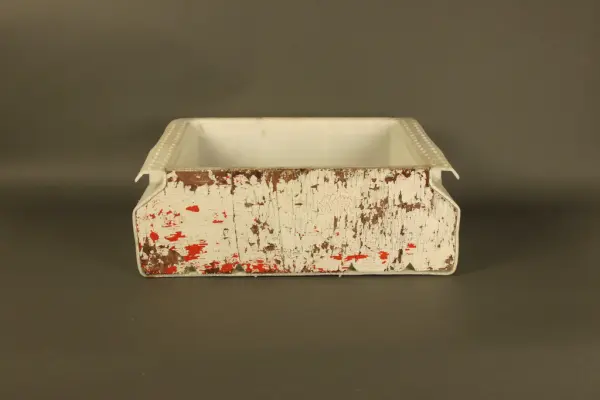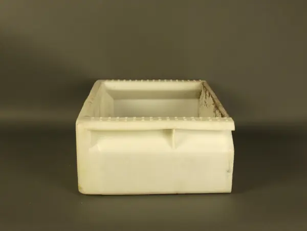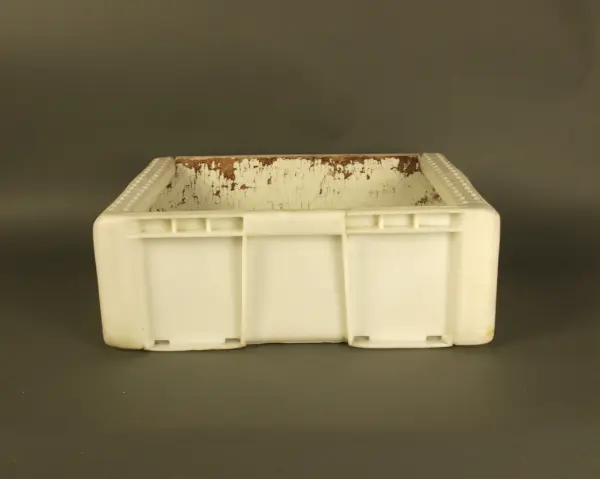 Gjenstanden er av hvit hardplast. Merke til fiskekassen er ukjent da identifikatorer som varemerke er blitt fjernet eller slitt bort med tiden. Det er ingen tegn til skader bortsatt fra der kassen har blitt avsagd ved tilpasning. Planken som ble brukt til å lage kassens fjerde vegg har begynt å bli slitt og fått avskalning på treverket. Kassen har vært eksponert for vær og vind da den stod til opplagring under en gammel vedsjå mellom 2013 og 2024.