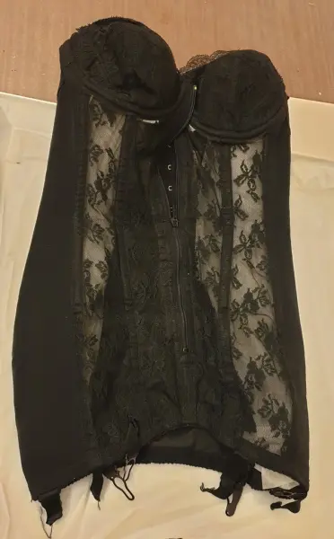 Korsett av gummiresår och spets. Svart. Dragkedja mitt fram med hyskor och hakar under. Axelband löstagbara. Kuporna har metallbygel. 6 st strumpebandshållare. Mitt bak parti av tu...