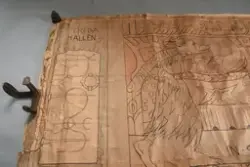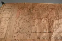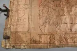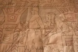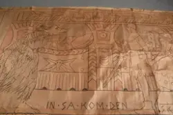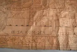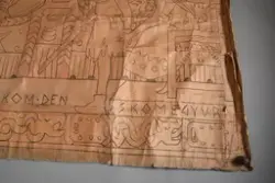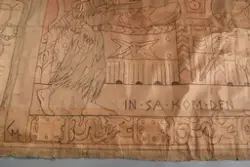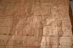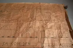 Heilt nedst på teppet er det ein vannrett bord med dekor av ormar og noko som kan tolkast som beslag/låser.