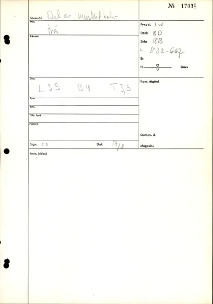 Vapnet är troligen en manskapsmusköt med spansk-nederländsk kolv som har haft flintsnapplås. Denna bössa är den enda i Vasas fyndmaterial som visar ett komplett vapen med sina tre delar hopsatta: stock 10689, kolv 30503, stockens främre del 17031. Stockens främre del 17031 är funnen på annan plats än de övriga delarna men brottytornas utseende visar att delarna kommer från ett och samma vapen. Laddstock 30505 hör också ihop med vapnet.