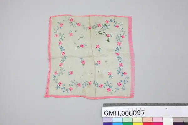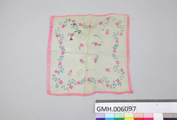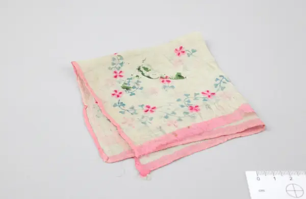 Dette lommetørkle var en av tre ting som Kari Wulff, født 1934, "stakk i lomma på vinterkåpa den ulykksalige morgenen 4. november 1944", da familien ble tvangsevakuert fra Hammerfest i Finnmark.