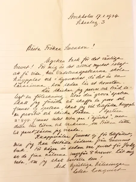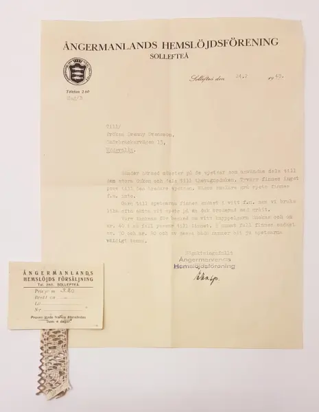 - Spetsproverna, tillsammans med ett brev daterat 1934, skickades på förfrågan till Swenny Svensson från Elsa Enquist i Stockholm. Ett annat brev med spets sändes från Ångermanlands hemslöjdsförening, daterat 1948 i Sollefteå.