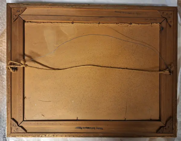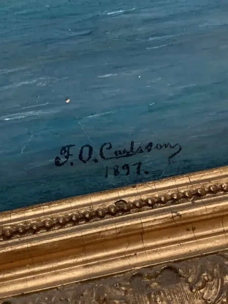 - Tavlan har varit i Georg Nilssons ägo, nära vän till Frans Oscar Carlsson som var kapten på s/s Aeolus och som tillverkat den fantastiska modellen vi har (S 0213). Målningen visar troligtvis ångfartyget s/s Zephyrs förlisning 10 december 1886, s/s Aeolus systerfartyg.