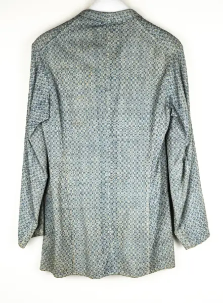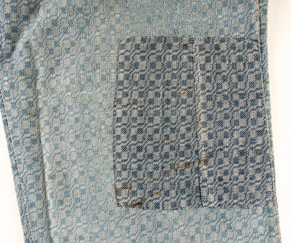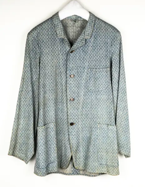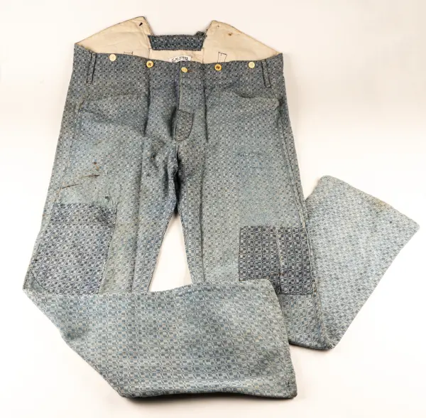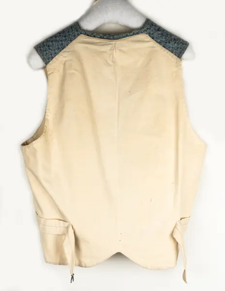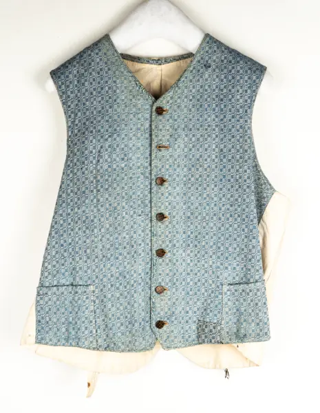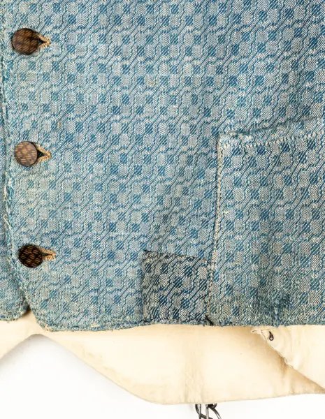 Tyget hemvävt på 1880-talet, av blått och vitt bomullsgarn. Västens rygg av helvitt bomullstyg.