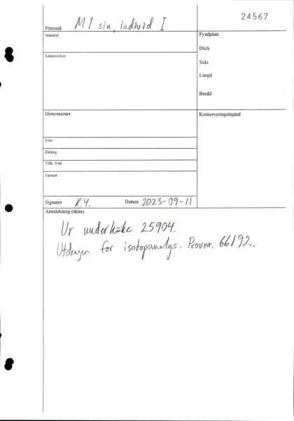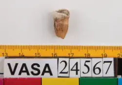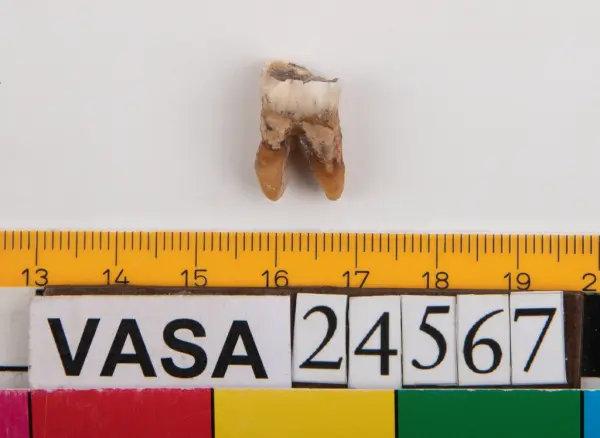 Kindtand från underkäke 25904 tillhörande skelettet av individ I som kallas för Ivar. Fyndnummer 19526 utgör huvudpost för skelettet.