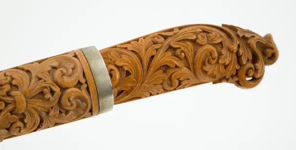 Han skar kompliserte og detaljrike mønstre som alltid var rene i skurden, men sjelden eller aldri olavshoder på skaftene. Derimot blei dype sveiver i akantusmønsteret et slags varemerke for Moene, som i en periode også skar dragemønster. Skaft og slir var som oftest holket og beslått med jern, nysølv eller sølv.