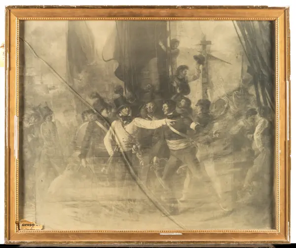Hertig Karl av Södermanland i slaget vid Hogland. Hertigen står i fas höger, iförd uniform utan rock men med ordensband och hatt, på flaggskeppet Konung Gustaf III:s däck. Han håll...