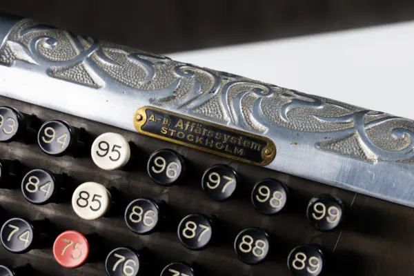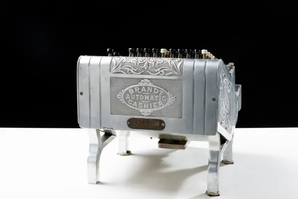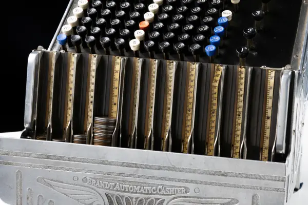 Myntapparat för kontant löneutbetalning använd vid Jönköpings Mekaniska Werkstads AB fram till 1981. Gåva med anledning av nedläggning av företaget Scanpump AB (f.d. Jönköpings Mekaniska Werkstad) i Jönköping i juni 1992.