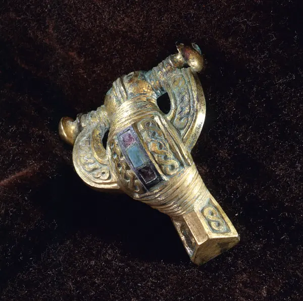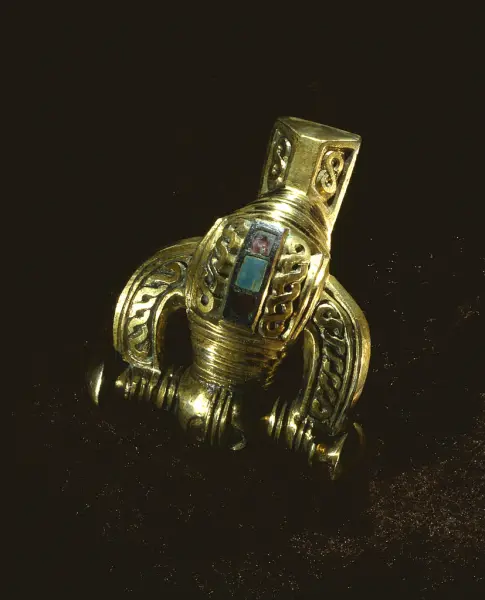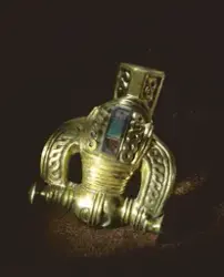 Kvinnan hade vid gravläggningen troligen varit klädd i sina finaste kläder, prydda med bland annat bronsspännen och glaspärlor, som daterats till vendeltid, 550 till 600 e.Kr. I vendeltida kvinnogravar är det vanligt att det förekommer tre dräktspännen, varav två är likartade parspännen att bära vid vardera axeln och ett tredje av annan typ invid halsen. I denna grav fanns ett par identiskt lika djurhuvudformade spännen av typiskt gotländskt utförande och ett förgyllt djurhuvudformat spänne av brons. Spännena användes för att hålla samman klädedräkten.