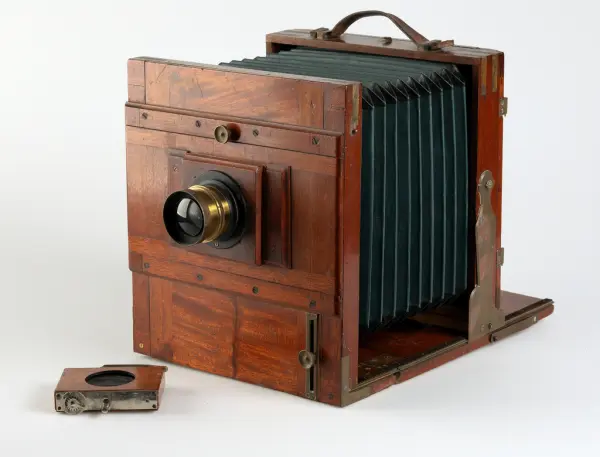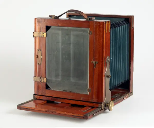 Gåva av Anders Wiberg innehållande två kameror, slutarsladd, glasplåtskassetter, framkallningsramar samt ett stativ. Albert Wahlström var morfar till Anders.