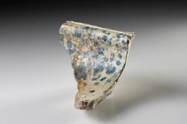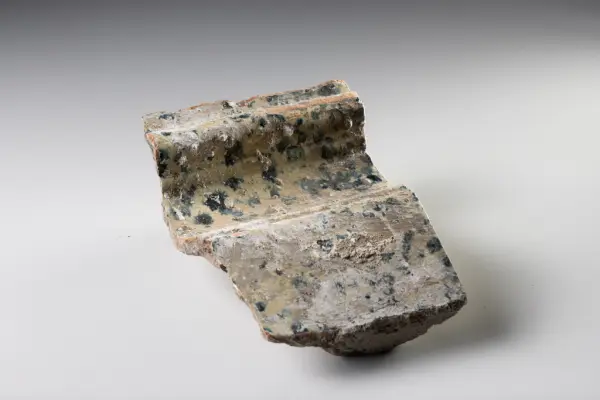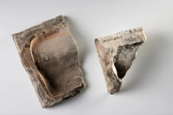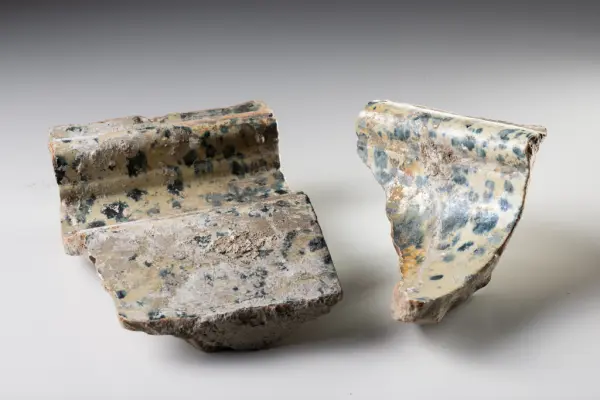 Kakelugnskakel, 2 st, från 1700-talet. Kakelbitarna är tillvaratagna 1985 på vinden till fastigheten vid Smedjegatan 18 i Jönköping. Byggnaden uppfördes på 1770-1780-talet.