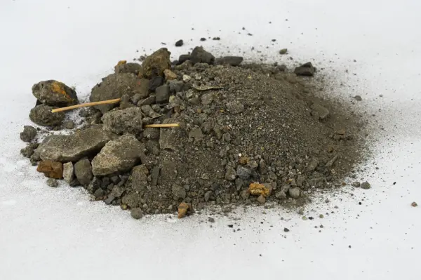 Material från järntillverkning påträffat vid utgrävning i och kring Smedjegatan i Visby. Från Nihléns undersökningar, publicerade i Jernkontorets Annaler, dec. 1927. Jordprov från Smedjegatan 10, schakt 1 bestående av grus och mindre material samt några växtdelar.