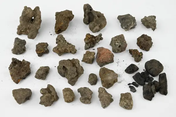 Material från järntillverkning påträffat vid utgrävning i och kring Smedjegatan i Visby. Från Nihléns undersökningar, publicerade i Jernkontorets Annaler, dec. 1927. De små slaggstyckena och annat hittades 1925 i schakt III vid Helgeandskyrkan under 1,10 m.