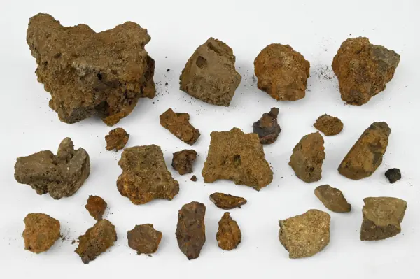 Material från järntillverkning påträffat vid utgrävning i och kring Smedjegatan i Visby. Från Nihléns undersökningar, publicerade i Jernkontorets Annaler, dec. 1927. Dessa stycken av slagg, keramik och kol hittades 1925 i schakt IV vid Hospitalsgränd på ett djup av 1,88 meter.