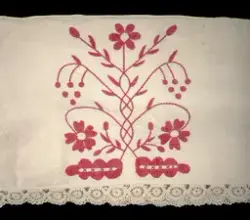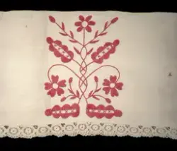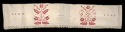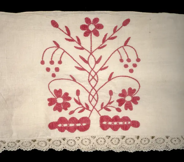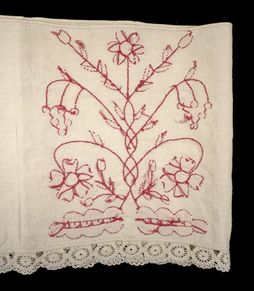 Initialerna "AC ND", broderade på hängklädet, står för Anna Christina Nilsdotter, född den 13 februari 1850 i Sällstorps socken, Viske härad, Halland.