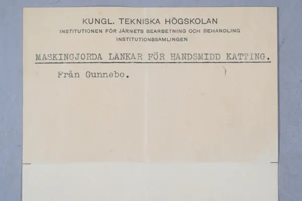 - Detta ingår i en samling prover från KTH som togs emot 1963 men inte katalogiserades. Samlingen består mest av metallprover men det finns även annat material.