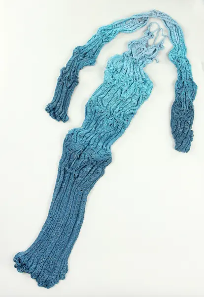 Klänningen är tillverkad av designer Emma Gudmundson, som är utbildad vid Borås textilhögskola (examen 2020). 2021 startade hon sitt eget märke "Emma Gudmundson" där hon arbetar med stickade produkter med fokus på "Zero-waste design", att inget ska produceras som ej används. Hennes kläder ska vara bärbara och samtidigt experimentella och produceras endast på beställning eller i litet antal för att inte överproducera. Hennes plagg stickas på stickmaskiner för hemmabruk. Gudmundson använder ofta bomullsgarner, med inslag av andra material för effekt och sticktekniker med långa synliga flotteringar.