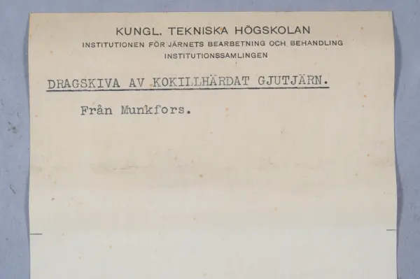 - Detta ingår i en samling prover från KTH som togs emot 1963 men inte katalogiserades. Samlingen består mest av metallprover men det finns även annat material.