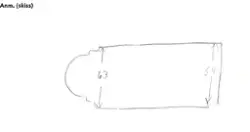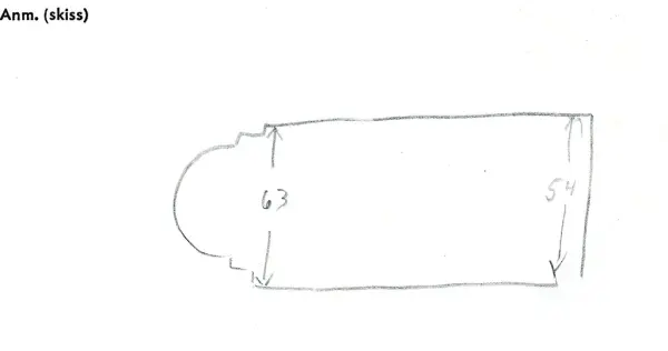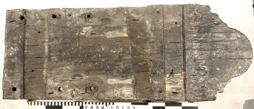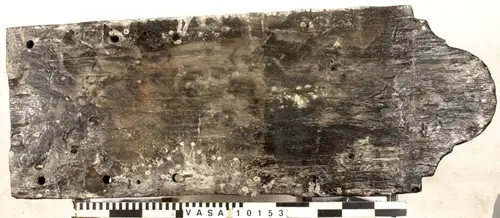 The bed is the base of the gun carriage, to which the other parts are attached; it is used here as the main find number for the carriage as a whole. The bed is a solid plank of even thickness, cut square at the front end and widening towards the back end, which is finished with a rounded, decorative shape extending past the cheeks. There are two shallow rebates across the bottom for the axletrees. There are three bolt holes along each side for the cheeks, as well as a number of nail holes for the cheeks, the axletree, and the iron straps which reinforced these attachments.