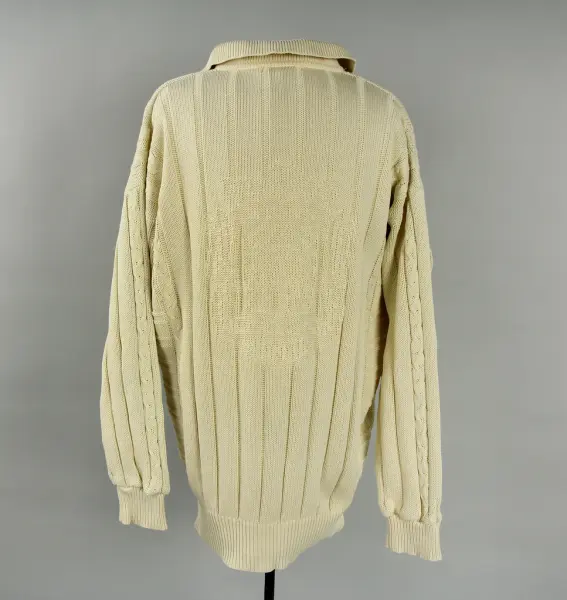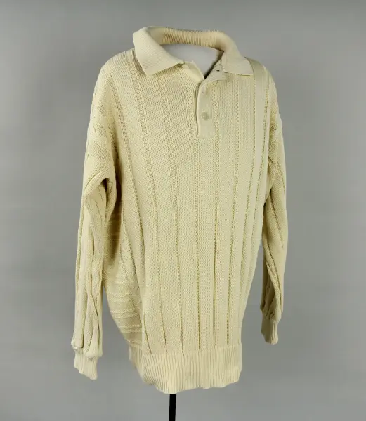 Tröjans krage tycks inte ha använts nedvikt (inga spår av vikning). Under 1980-talet var det modernt att ha kragar av denna typ uppvikt, även fast de traditionellt har använts nedvikta. Se exempel i gåvan medföljande reklamblad.