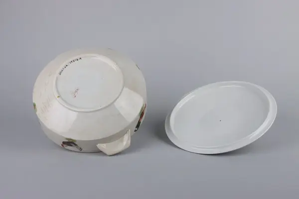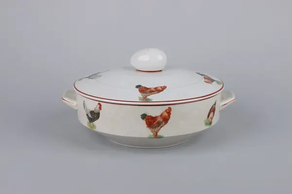Äggterrin med lock, rund form och raka sidor. Locket är krönt upptill med ett handtag i form av ett ägg. På terrinens sidor finns två månghörnande hänklar dekorerade med röda linjer, nedtill en indragen midja och under en låg fotring. Upptill runt om handtagets fäste en röd kant, kring lockets och terrinens kant löper röda raka ... Äggterrin med lock, rund form och raka sidor. Locket är krönt upptill med ett handtag i form av ett ägg. På terrinens sidor finns två månghörnande hänklar dekorerade med röda linjer, nedtill en indragen midja och under en låg fotring. Upptill runt om handtagets fäste en röd kant, kring lockets och terrinens kant löper röda raka bårder På locket och skålens sidor dekor av höns och tuppar i olika raser. Under skålen fabriksstämpel med Gefle i skrivstil. Insidan av terrinen är odekorerad.