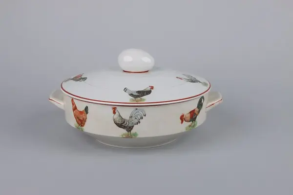 Äggterrin med lock, rund form och raka sidor. Locket är krönt upptill med ett handtag i form av ett ägg. På terrinens sidor finns två månghörnande hänklar dekorerade med röda linjer, nedtill en indragen midja och under en låg fotring. Upptill runt om handtagets fäste en röd kant, kring lockets och terrinens kant löper röda raka bårder På locket och skålens sidor dekor av höns och tuppar i olika raser. Under skålen fabriksstämpel med Gefle i skrivstil. Insidan av terrinen är odekorerad.