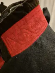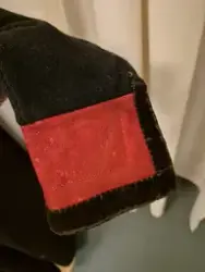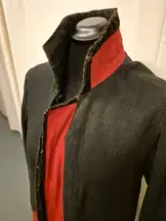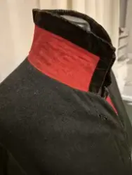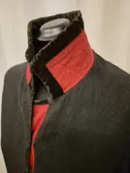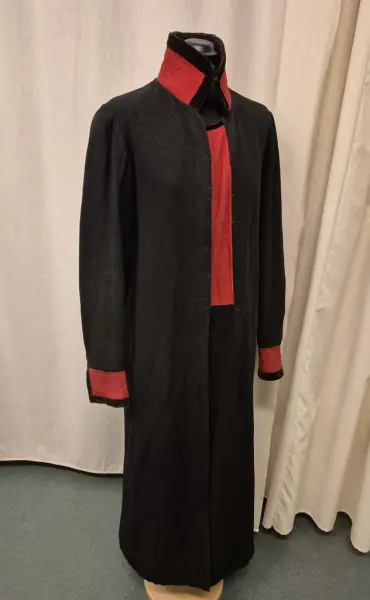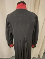 Långrock av svart ylletyg i tuskaftsbindning. Rocken skuren i tre långa våder, den mittersta bakvåden är från midjan utsvängd i närmast liknande paraplyveck, som nertill bildar vidd. Axelpartiet är draget långt bakåt. Knäppning till midjan av hyskor och hakar över en slå av rött ylletyg, 5,5 cm bred. Mycket hög, rund ståndkrage, klädd med rött tyg och trädd med lingarn i snirklade mönster, ytterkanten klädd med drygt 2 cm bred svartbrun sammetsremsa. Ärmen lång (67 cm), smalnande neråt, utökad med en 6,5 cm bred röd tygslå med trätt vågmönster, kantad runtom med svartbrun sammet, s.k. "Abborrar".