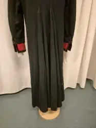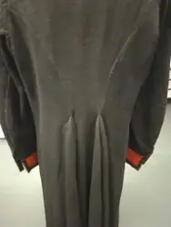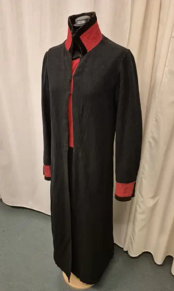 Långrock av svart ylletyg i tuskaftsbindning. Rocken skuren i tre långa våder, den mittersta bakvåden är från midjan utsvängd i när...