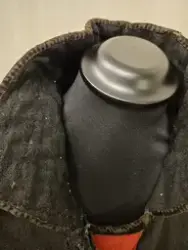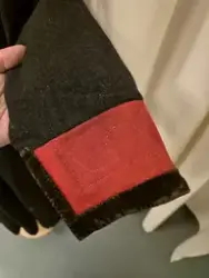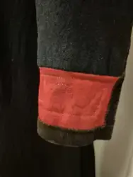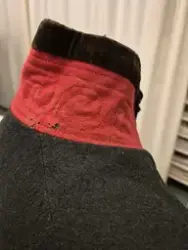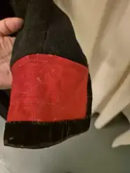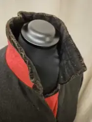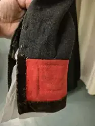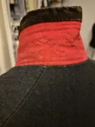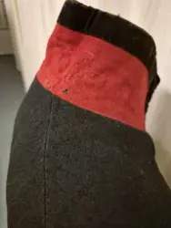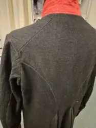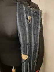 Rocken är ofållad nertill. Foder av troligen hemvävt ylletyg i mörkblått, randat i ljusare blått och beige, ärmarna av smalrandigt, brunt tyg. Innerficka av grått linne.