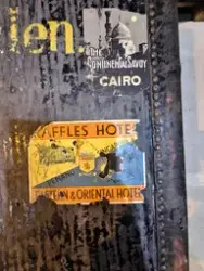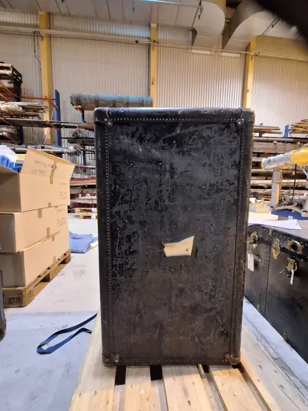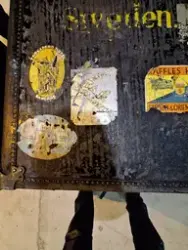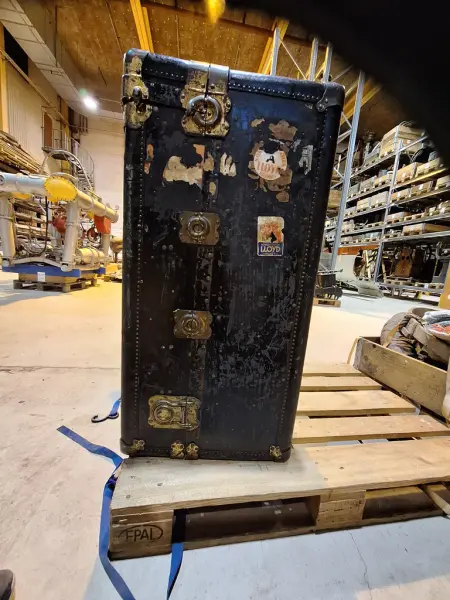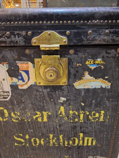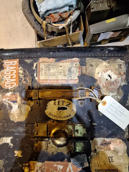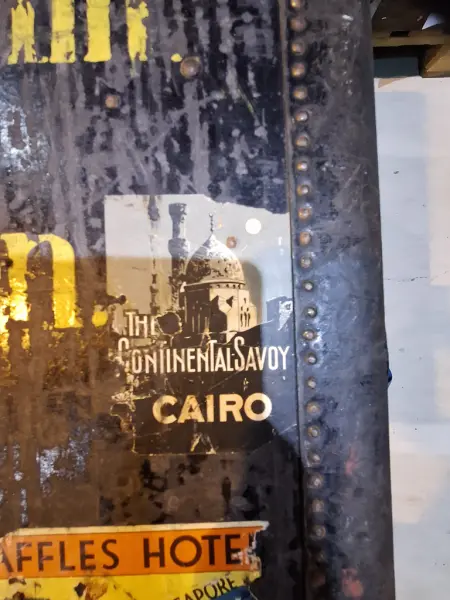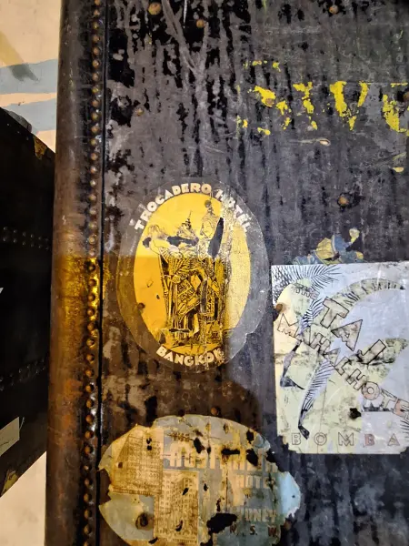 På kofferten sitter klistermärken från 8 juni 1939 från Bremen via flera platser (i okänd ordning) såsom New York, Canada, Singapore, Bankok, Bombay, Sidney, Fiji, Cairo, Barcelona.