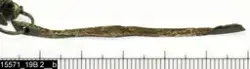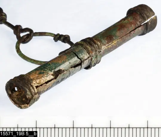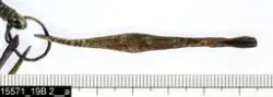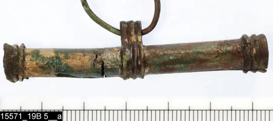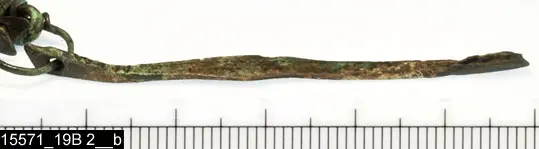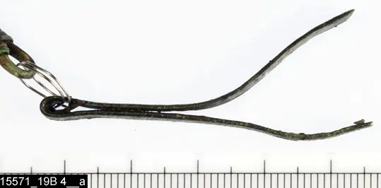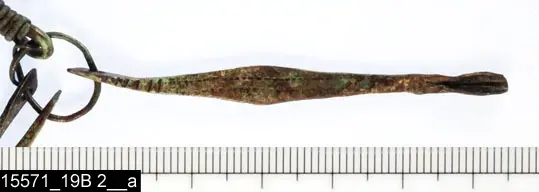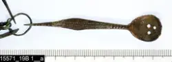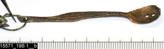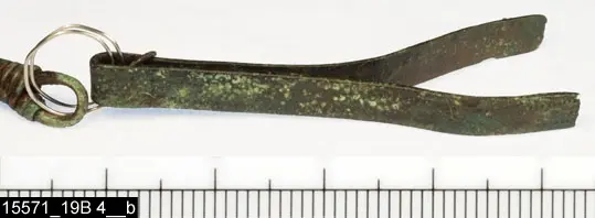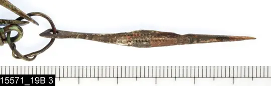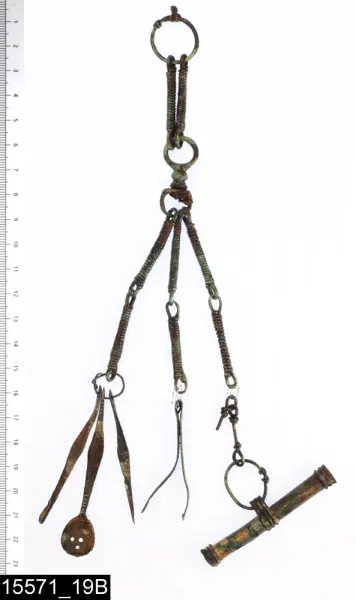 Redskapskedja av brons, fyndnr 17. Kedja av brons med vidhängande pincett, örslev, miniatyrsked och syl. Nålhus av brons har troligen varit fäst vid kedjan (se invnr 15571_19B:1-5).