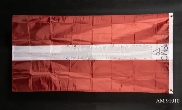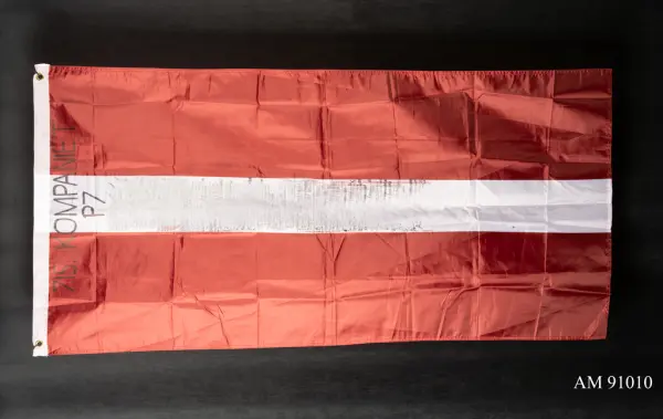 En lettiska flagga från den första svenska truppinsatsen i Lettland som allierad i Nato. Flaggan innehåller namnunderskrifter från det 715:e kompaniets officerare och soldater vid Camp Valdemar. Kompaniet ingick bland flera andra i den reducerade bataljonen på cirka 500 svenska soldater från Södra skånska regementet P7. Av integritetsskäl har namnen redigerats bort på bilderna.