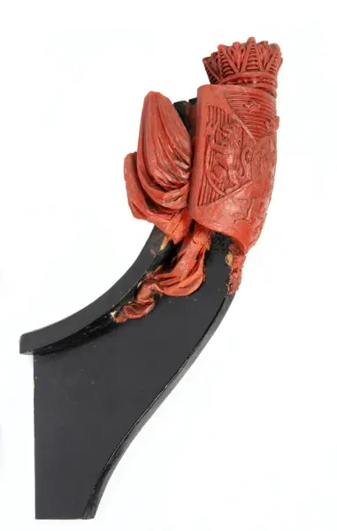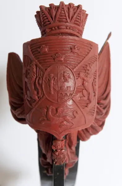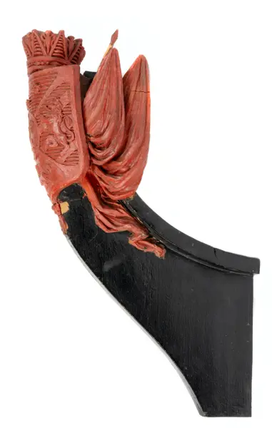 about Förslag till linjeskeppet PRINS OSCARs galjon. Röd vax.