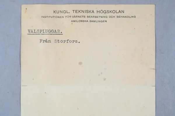 - Detta ingår i en samling prover från KTH som togs emot 1963 men inte katalogiserades. Samlingen består mest av metallprover men det finns även annat material.