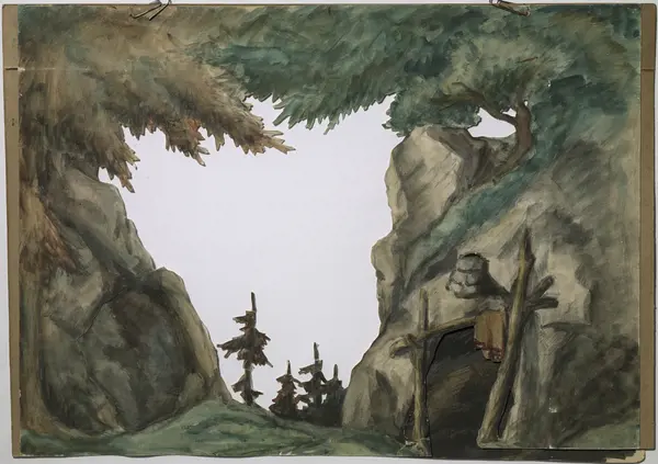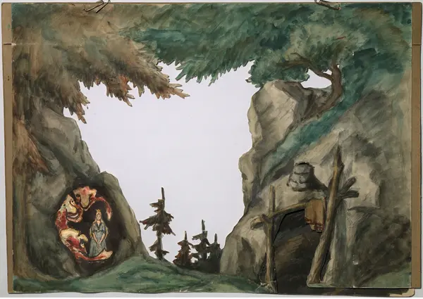 Ofte kjøpte man kulissene og figurene fra en trykker, noen tegnet dem imidlertid selv. Dette mellomteppe er håndtegnet. Nederst til venstre har det en transparent, det vil si at man kan se en figur når teppet er belyst bakfra.