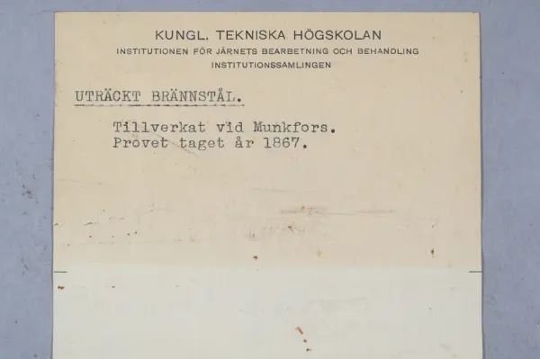 - Detta ingår i en samling prover från KTH som togs emot 1963 men inte katalogiserades. Samlingen består mest av metallprover men det finns även annat material.