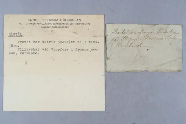 - Detta ingår i en samling prover från KTH som togs emot 1963 men inte katalogiserades. Samlingen består mest av metallprover men det finns även annat material.