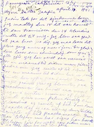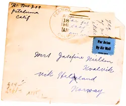 Dette amerikabrevet ble sendt fra California i USA våren 1941 til Josefine Nilsen Kvalvik på Vik i Helgeland, i en periode da Norge var okkupert av Nazi-Tyskland. Brevet dokumenterer både personlige familieforbindelser over Atlanteren og de strenge kontrollmekanismene som preget postgangen under okkupasjonen.