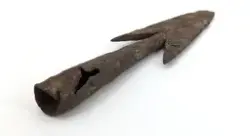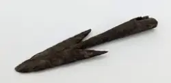 - Spjutspets av järn med hullingar. Något skadad på den runda holken. Okänd fyndort.