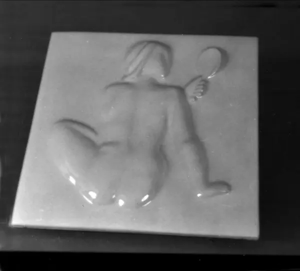 Tillverkad av Upsala-Ekeby, Uppsala. Upsala-Ekeby i Ekebybruk i nordväst om Uppsala grundades 1886. Tillverkade tegel, keramik och kakelugnar och från 1926 kakelplattor. 1916 fusion med Upsala Kakelfabrik, 1917 fusion med Boivies Kakelfabrik i Uppsala. Köpte 1937 och lade ned S:t Eriks Lervarufabriker i Uppsala . 1926 satsning på tillverkning av kakelplattor. 1939 automatiseras platttillverkningen. 1960 övergår man till en tunnare dimension på kaklet.1964 koncern, flera fabriker. 1977/78 lades fabriken i Ekebybruk ned. Se dokumentation vid nedläggningen och tidigare intervjuer, foton, kataloger och företagshistorik.