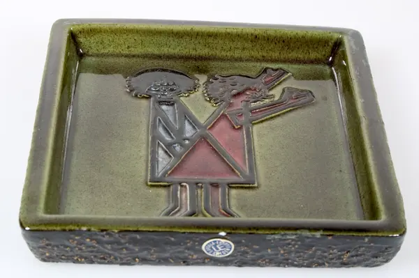 Tillverkad av Upsala-Ekeby AB, formgiven av Ingrid Atterberg, verksam vid företaget 1944-63. Askfatet tillverkat 1962 inför invigningen av Folke Bernadotte-hemmet i Uppsala.