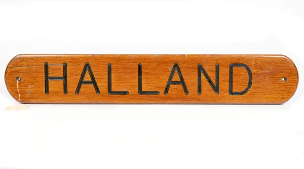 Då HALLANDs namnbräda byttes ut ca 1980 på Muskö, skulle den kasseras, men givaren tog den tillvara.