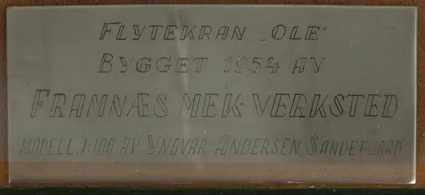 - Modell av flytekran "Ole I", ved Framnæs mek. Værksted A/S. Norges største flytekran (1953/54).