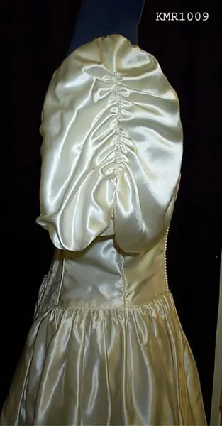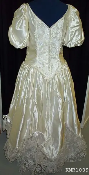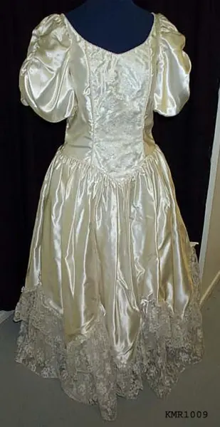 Brudekjole, i hvit silkeaktig stoff, med syntetisk blonderkapper nederst på kjolen 13 cm bred som er sydd i V fasonger, med små sløyfer festet øverst ved hver V, underkjolen er nederste del festet med samme blonderstoffet 50 cm bredde, slik at det ser ut som flere lag kappe. kjolen er avtatt i livet og sømmen er formet som en V i midjen foran, hvor også 15 cm bred blonderstoff er innfelt som pynt i kjolens forstykke, båtformet hals, korte vide ermer