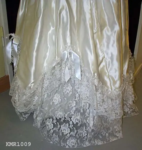 Brudekjole, i hvit silkeaktig stoff, med syntetisk blonderkapper nederst på kjolen 13 cm bred som er sydd i V fasonger, med små sløyfer festet øverst ved hver V, underkjolen er ned...