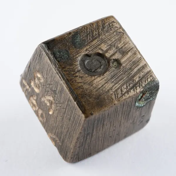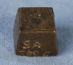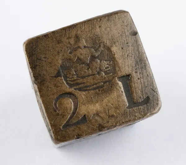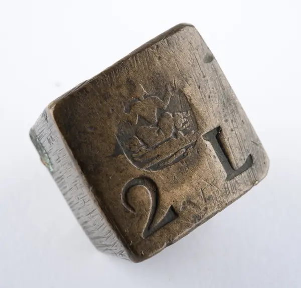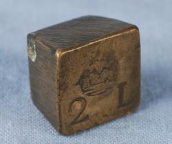 - Handelsvektlodd av messing med enheten 2 lodd. Stemplet øverst på oversiden med St. Hallvard og nederst med 2 L for enheten. På undersiden stemplet C for Christiania. Datering ca. 1825-34.