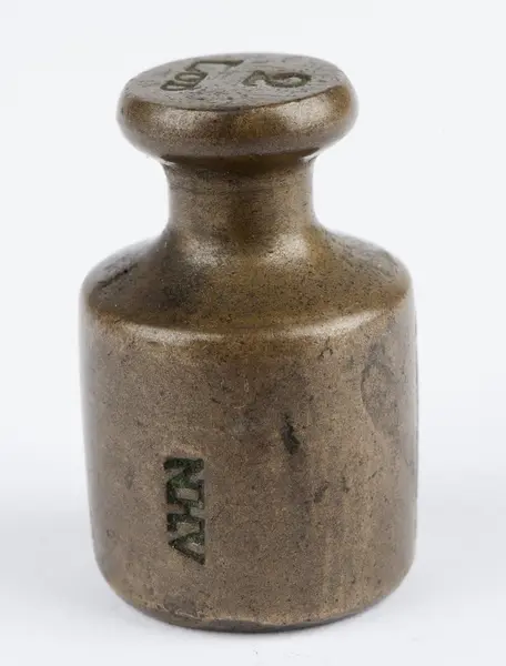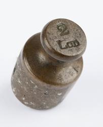 - 2 Lod Norsk Handels Vægt (NHV) justeret af Henrik Clausen (HC i fraktur på motstående side af NHV) justermester i Christiania 1835-77.