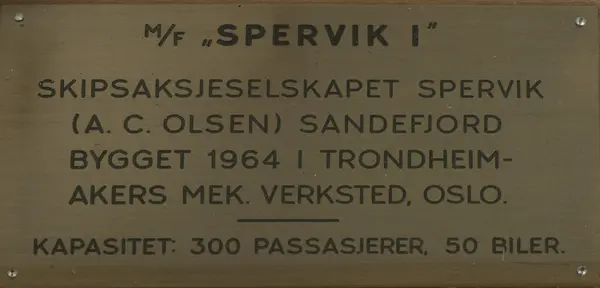 - "M/F "SPERVIK 1" SKIPSAKSJESELSKAPET SPERVIK (A.C. OLSEN) SANDEFJORD BYGGET 1969 I TRONDHEIM AKERS MEK. VERKSTED, OSLO KAPASITET 300 PASSASJERER, 50 BILER".