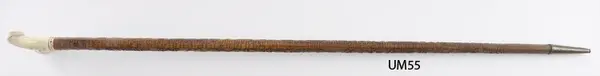 Käpp tillverkad av en runstav, kompletterad med krycka av elfenben samt doppsko av mässing. Skador på kryckan; sprickor samt del av handtaget bortslaget.